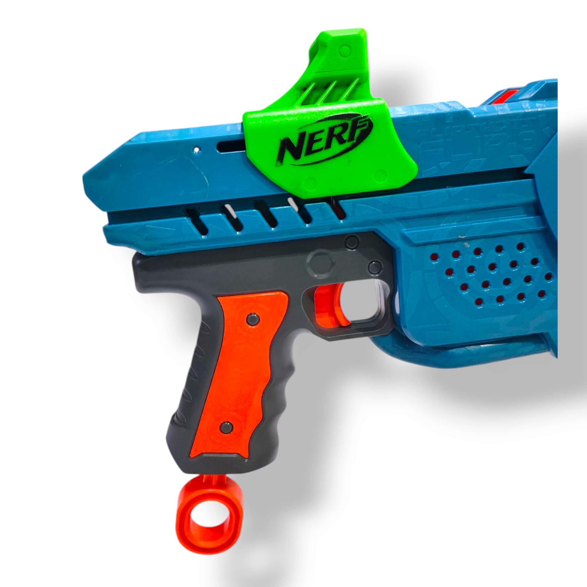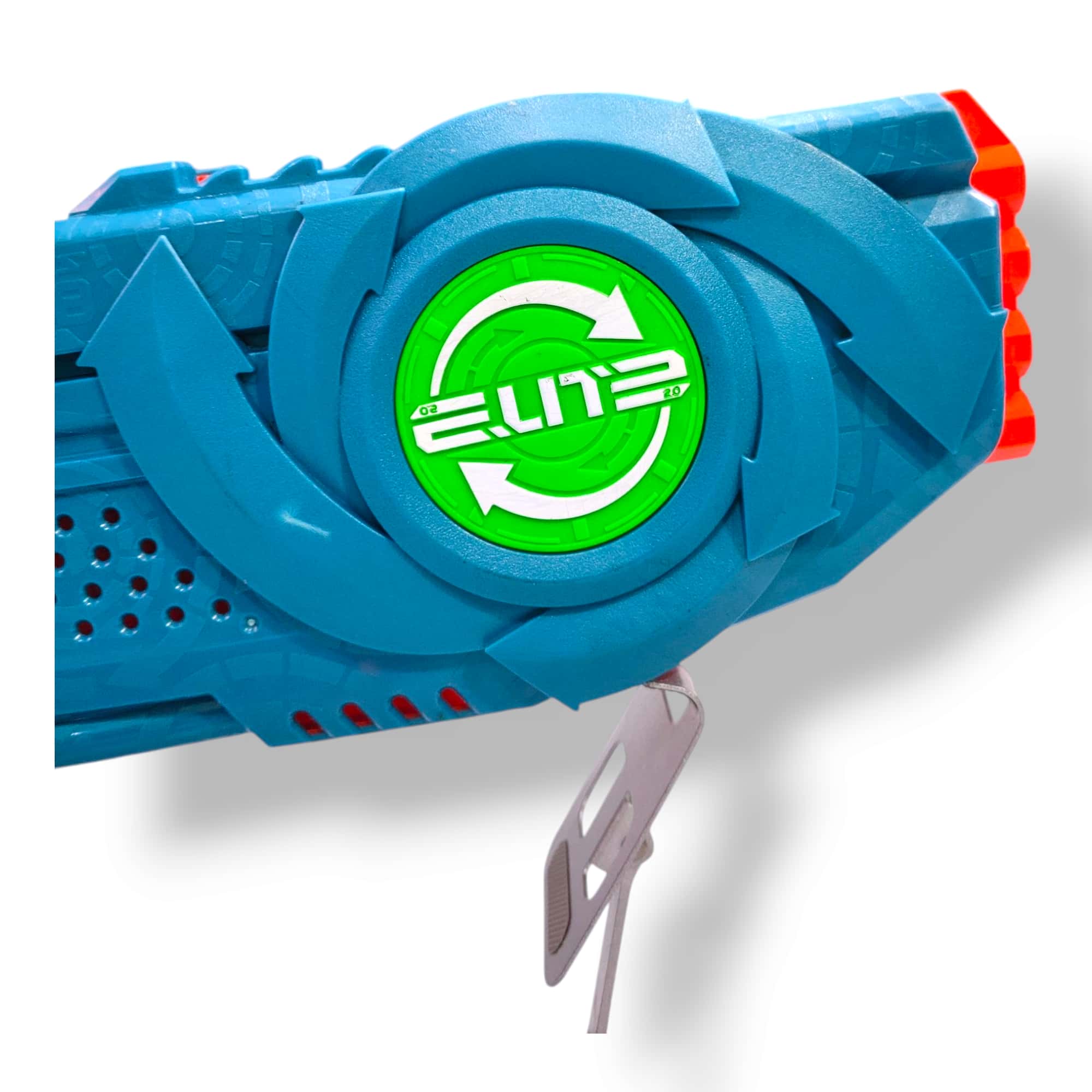 Flip Mechanism: The green sight on top of the blaster doubles as the flip mechanism. By pulling it back, the entire double-sided barrel assembly rotates 180 degrees, bringing the loaded rear barrels to the front.