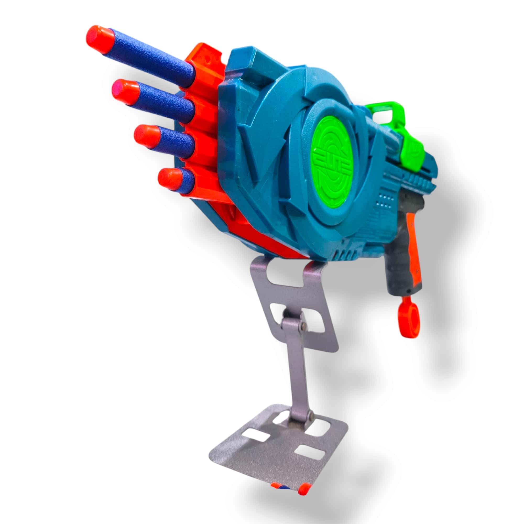 Firing: Once primed, press the trigger (orange) to fire a single dart from one of the currently front-facing barrels.